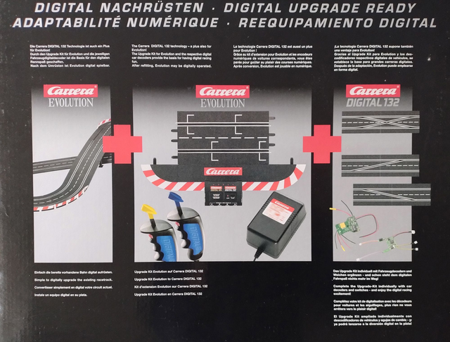 - Upgrade je analoge Evolution baan naar D132. Bestaat uit de D132 blackbox, Carrera D132 transformer en twee digitale speedcontrolers. Voor het geschikt maken van je Evolution auto's op de D132 baan zijn er verschillende digitale decoders te krijgen.
